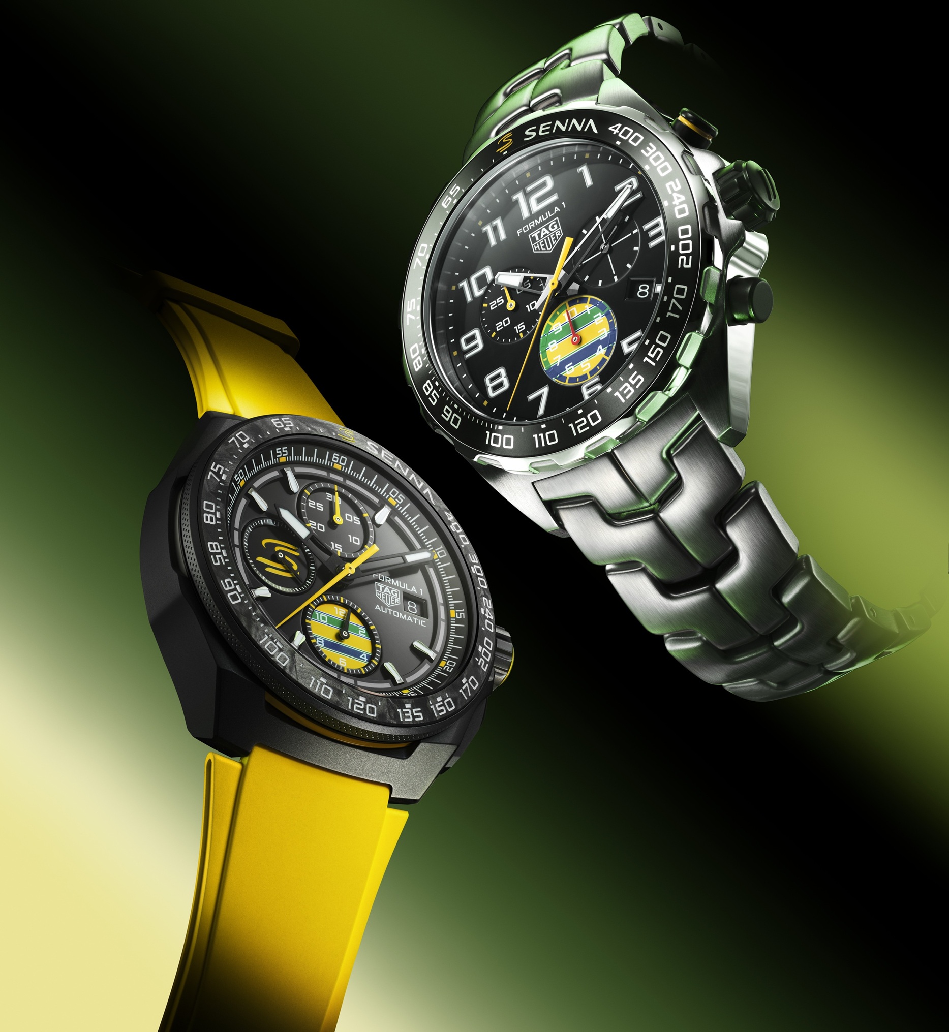První z edic TAG Heuer Formula 1 Chronograph x Senna, vedená Sennovým neohroženým duchem a neutuchající snahou o dokonalost, posouvá partnerství dále díky novému dynamickému vyjádření špičkové úrovně poháněné automatickým strojkem. Design hodinek čerpá inspiraci ze Sennovy přilby a jeho brazilské identity. Černému číselníku s efektem slunečního brusu dodávají energii výrazné akcenty ve žluté barvě. Subciferník na 6. hodině je v barvách národní vlajky, na 12. hodině se nachází 30minutový sčítač stopek se žlutě lakovanou ručičkou, na 9. hodině průběžná vteřinovka se žlutým logem „S“ a nakonec žlutě lakovaná centrální sekundová ručička pohybující se s velkou přesností. Nové indexy inspirované livrejí Formule 1® spolu se skeletonovými černě lakovanými hodinovými a minutovými ručičkami zvyšují čitelnost a styl.