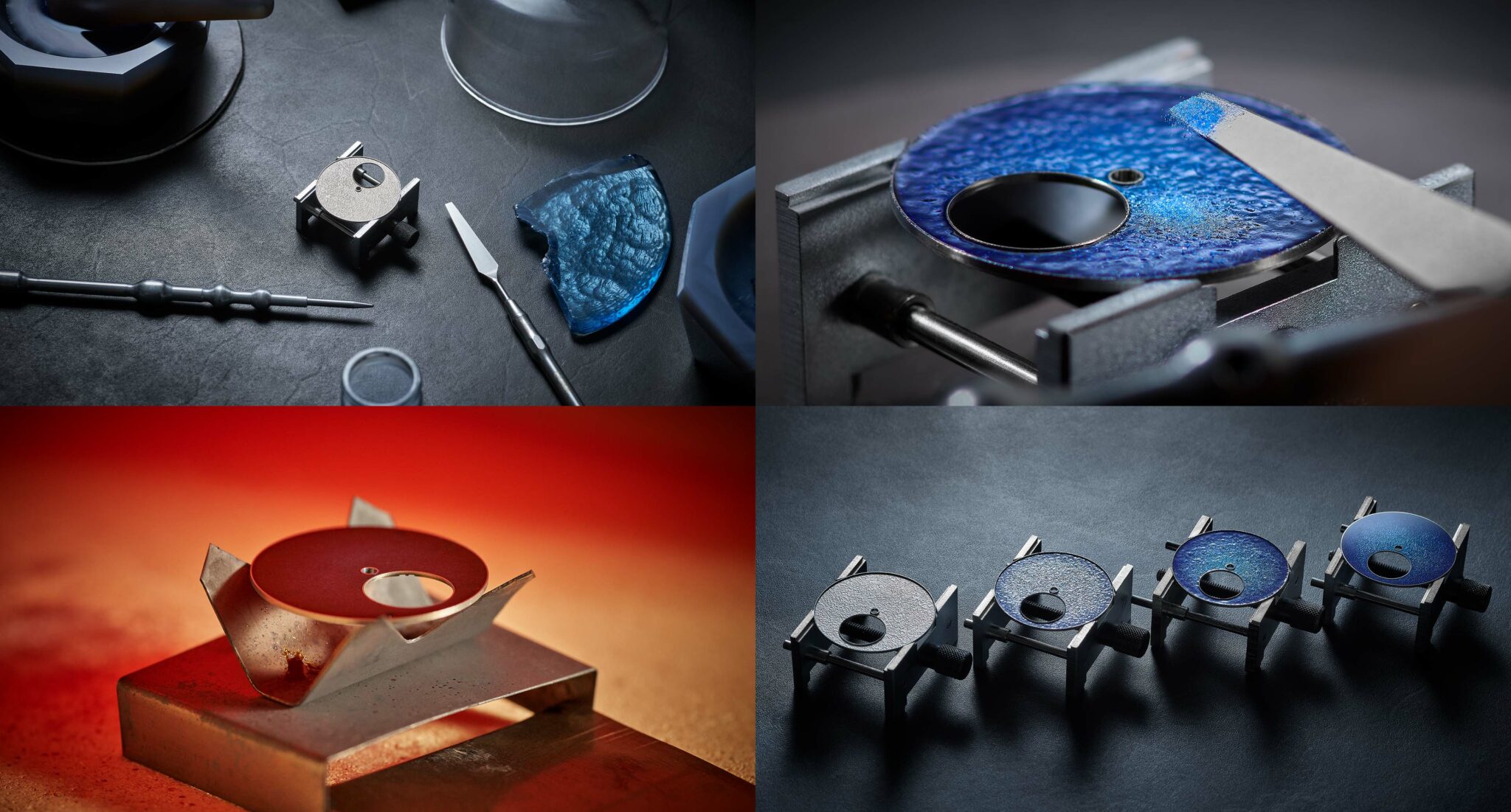 Základem není mosaz, ale zlato. Na něj je vytepán zrnitý vzor, který vytváří texturu připomínající tepaný kov. Následně přichází na řadu alchymie smaltování. Řemeslníci nanášejí tři různé barevné pigmenty, které se po výpalu v peci (proces se opakuje dvanáctkrát!) slijí do fascinujícího gradientu zvaného Aqua Blue.