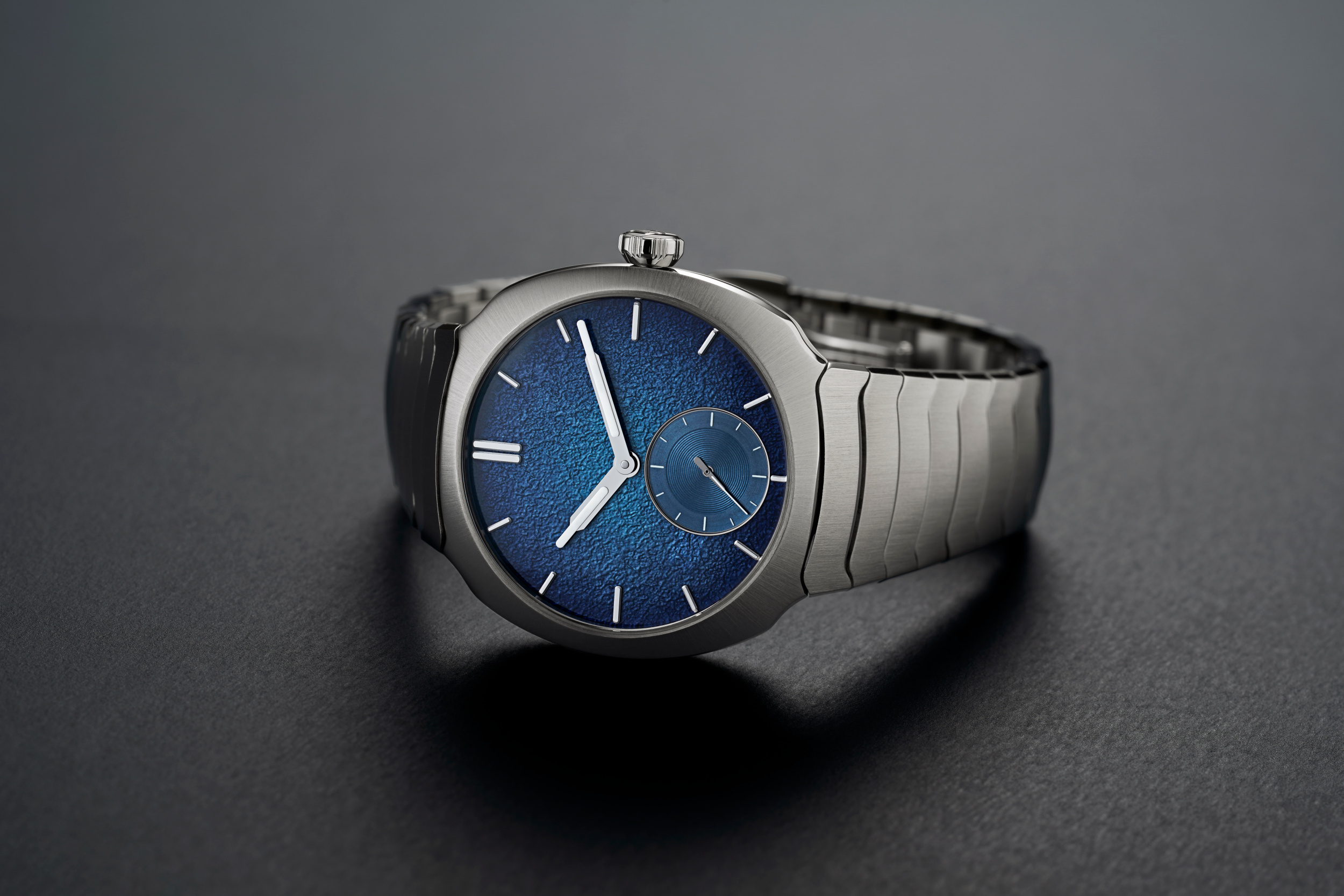 První věc, která vás na hodinkách udeří do očí, je ciferník. A slovo „ciferník“ je zde možná až urážlivé zjednodušení. Jedná se o umělecké dílo. H. Moser & Cie. je mistrem tzv. fumé (kouřových) číselníků, ale zde techniku posunuli na novou úroveň.