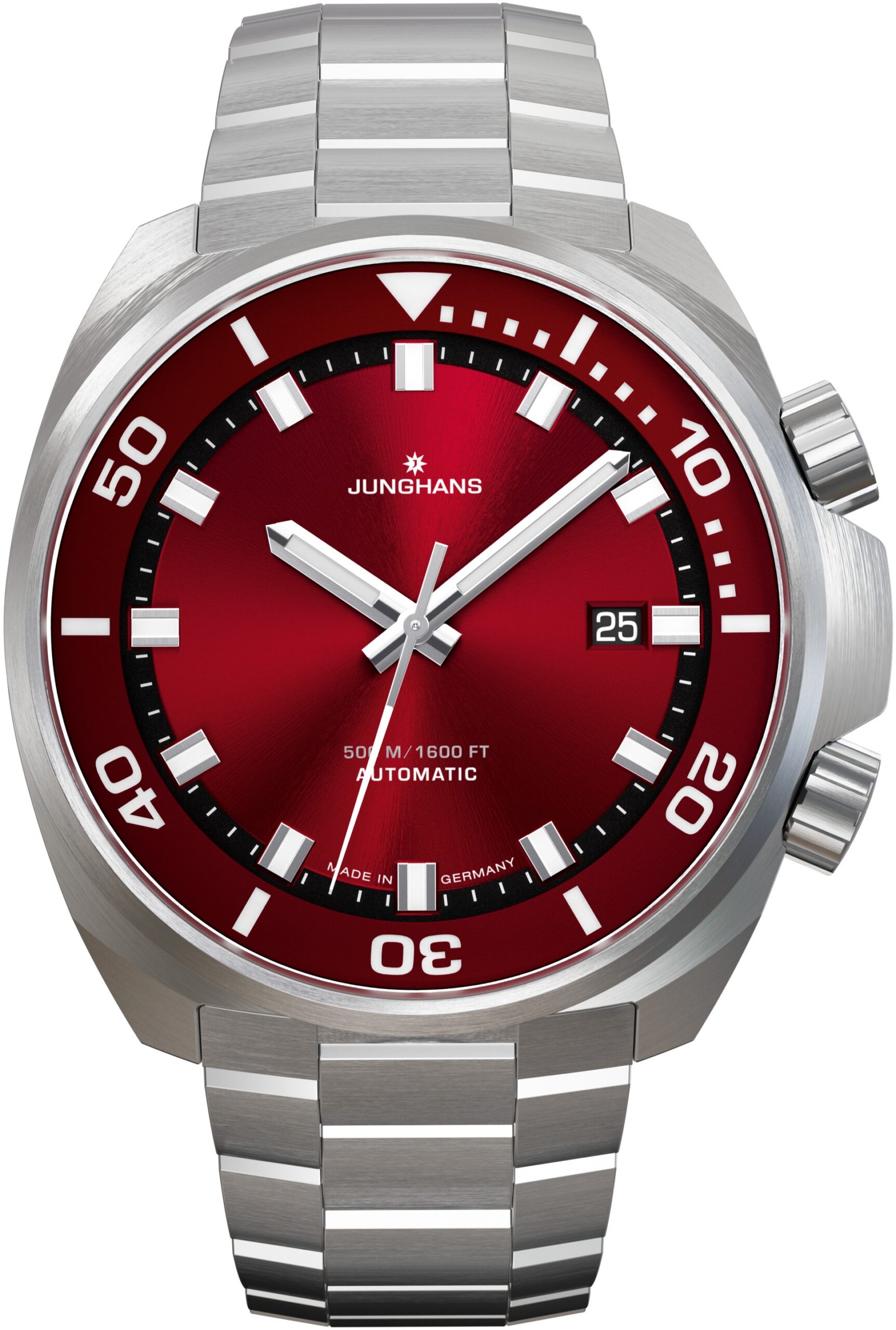 Junghans přichází také s promyšleným systémem uchycení náramku. Třířadý ocelový náramek opatřený překlápěcí sponou nabízí dvě možnosti prodloužení: standardní potápěčskou extenzi o 26 milimetrů a vlastní „click“ systém umožňující jemné nastavení o 22 milimetrů přímo během nošení, když je spona zavřená. Díky funkci Quick Release lze ocelový náramek snadno vyměnit za řemínek ze syntetického kaučuku, který je součástí balení a dodá hodinkám sportovnější vzhled.