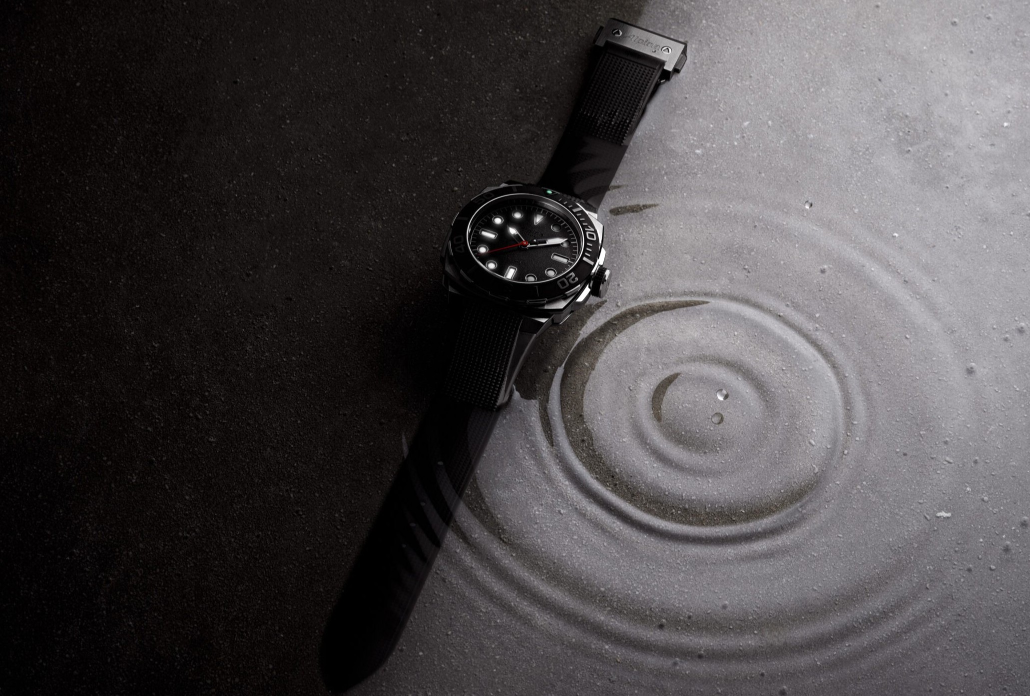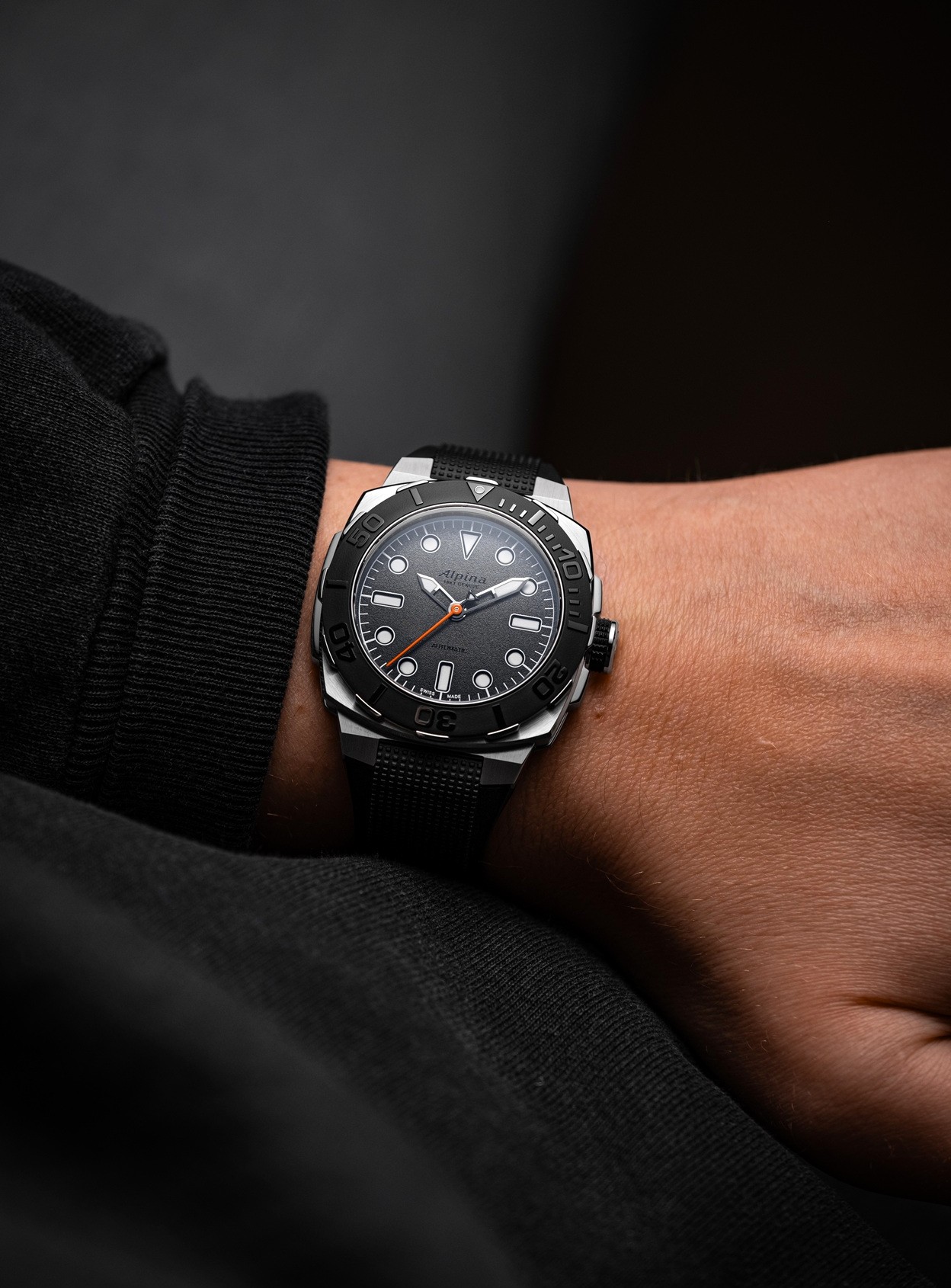 Ohnivě oranžová sekundová ručička tančí na pozadí matně černého číselníku s jemně strukturovaným povrchem, přelakovaným do vysokého lesku. Logo a nápis „Automatic“ splývají s podkladem v téměř neviditelné černé – z určitých úhlů jako by se zcela rozplynuly. Právě tím víc vynikne ten zářivý oranžový akcent a křídově bílá luminiscence, kterou Alpina vyvinula přímo pro tuto limitovanou edici. Prominentní rehautový prstenec z původní kolekce ustoupil do pozadí. Číselník tak získal větší průměr, prostor pro výraznější indexy a integrovanou minutovou stupnici, která výrazně zlepšuje čitelnost při měření sekund. Ikonické protizávaží na sekundové ručce zůstalo černé a elegantně upozorňuje na prodlouženou špičku. Matně černá keramická vložka lunety ladí s uhlově strukturovaným povrchem číselníku.