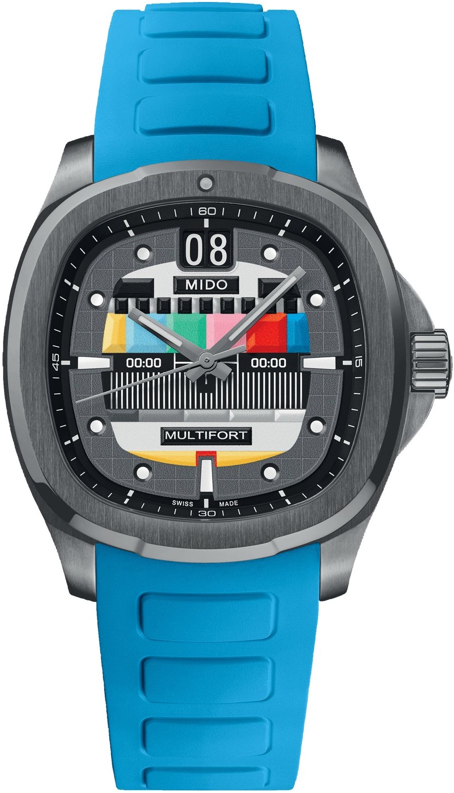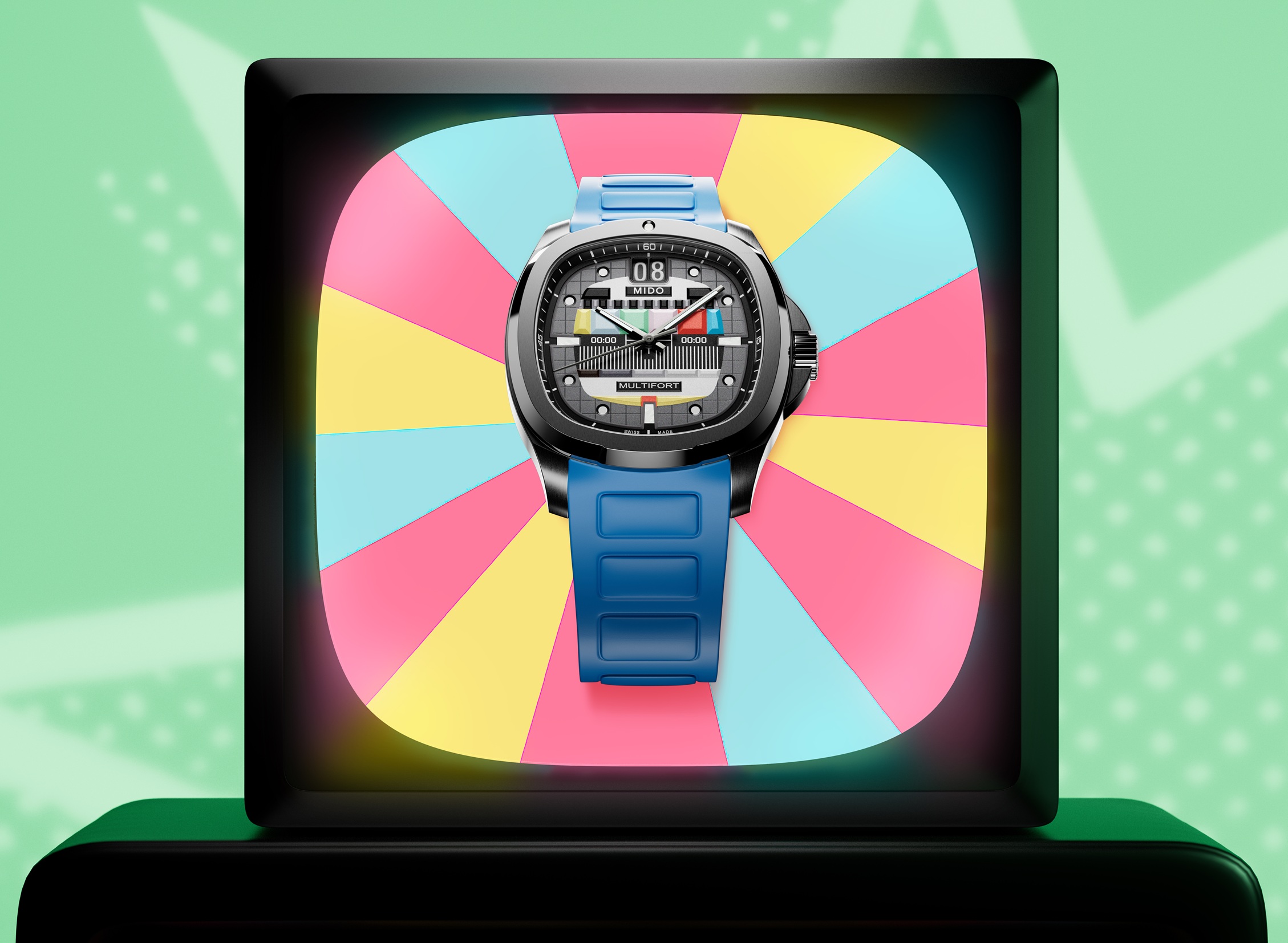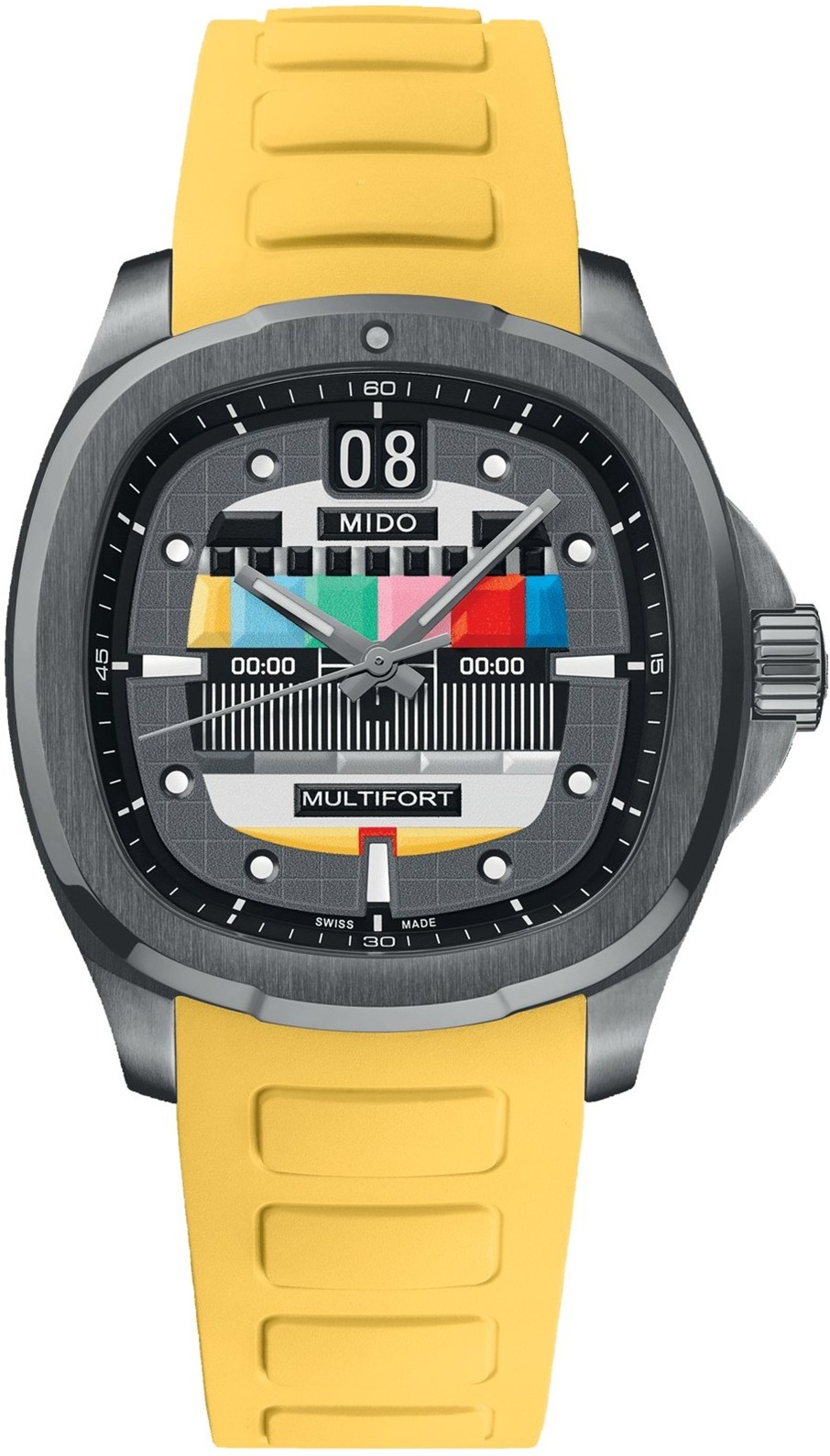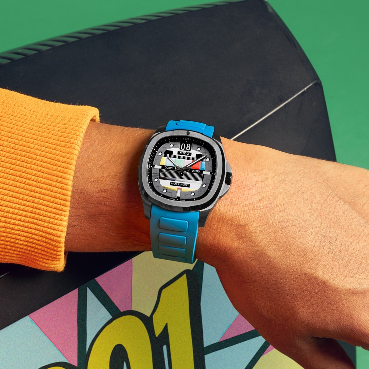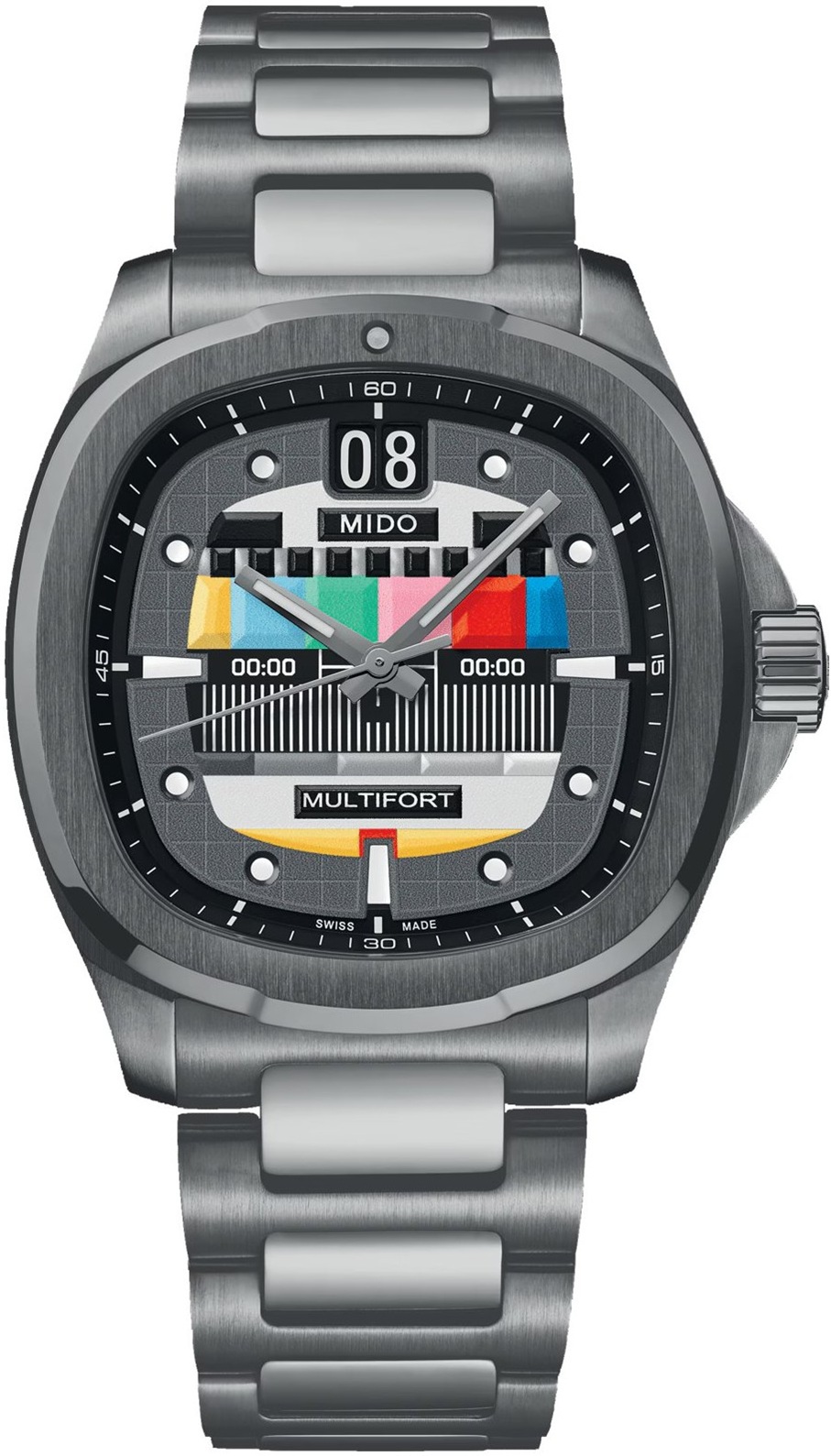 MIDO představuje druhý díl své kultovní série: Multifort TV Big Date S01E02 věrný svému hranatému „televiznímu“ pouzdru se zaoblenými rohy, inspirovanému modely MIDO ze 70. let. V této epizodě si inscenace pohrává s kontrasty v objemu a barvách, které jsou zmírněny nádechem šedi. Ústřední reliéfní motiv připomíná barevný pruhový displej, který je k vidění na historických televizorech.
