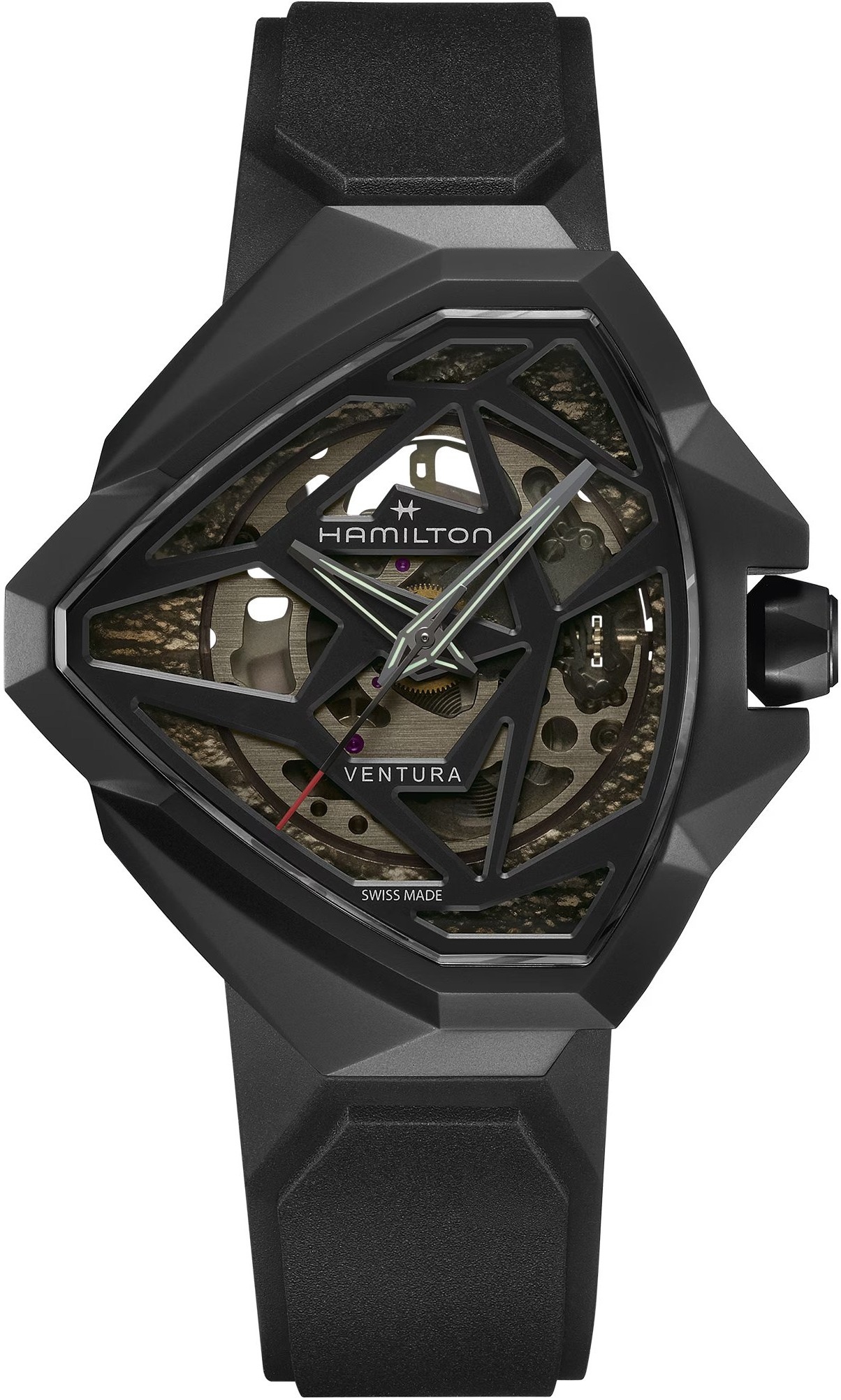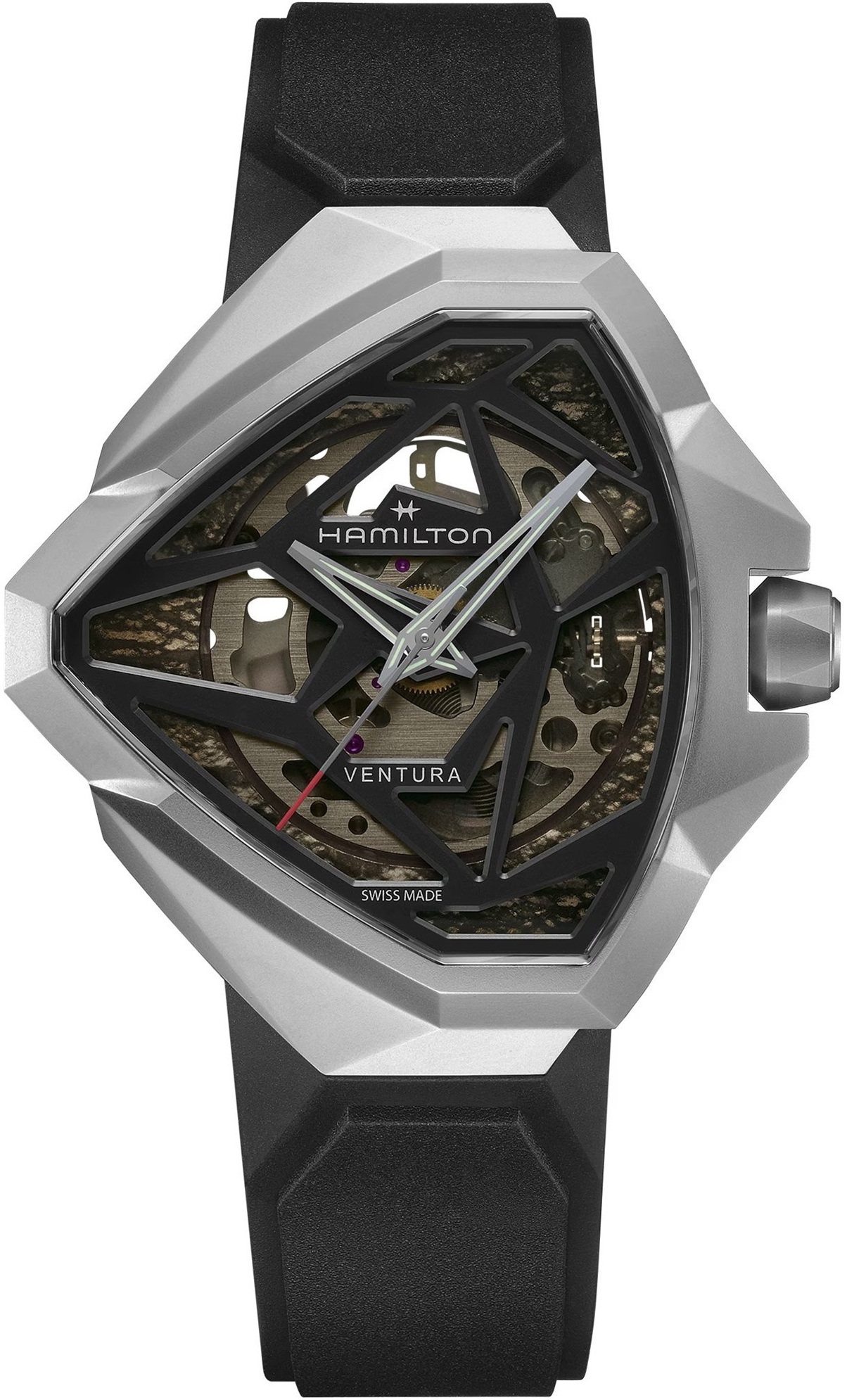 Společnost Hamilton byla založena v roce 1892 v Pensylvánii a vytváří hodinky s jedinečnou rovnováhou mezi autenticitou a inovací. Je členem skupiny Swatch Group, světového lídra v oblasti výroby a distribuce hodinek a ve svých současných kolekcích spojuje amerického ducha s pravou švýcarskou precizností. Model Ventura Edge Skeleton se odklání od ikonických schodovitých kontur původního trojúhelníkového pouzdra Ventura a představuje hranatý tvar pouzdra, který se vymyká tradičním designovým pravidlům. Ocelové pouzdro má velikost 51 x 47 milimetrů a je k dispozici také ve variantě s povrchovou PVD úpravou černé barvy. Obě verze mají hranaté ocelové pouzdro doplněné specificky tvarovaným černým kaučukovým řemínkem s trnovou sponou, jenž dotváří sportovní design hodinek.
