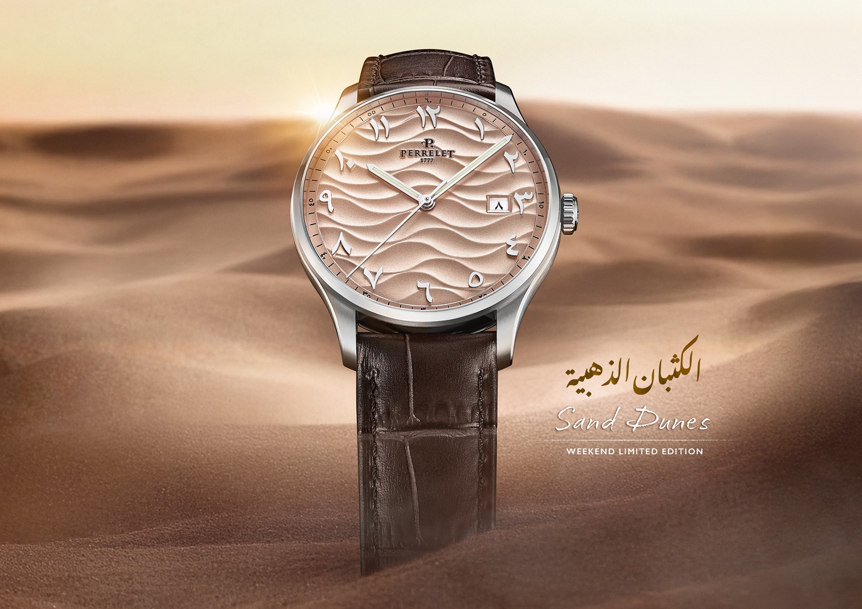 V tomto roce o pár měsíců dříve představila značka Perrelet limitovanou edici Weekend Sand Dunes Middle East v počtu 99 kusů, navrženou speciálně pro Blízký východ a oslavující kouzlo Arabské pouště. A právě číselník v teplém odstínu pouštního písku oživeného dunami je její dominantou. Oproti modré edici disponuje lososový číselník luminiscencí Super-LumiNova® na ručičkách, která zajišťuje optimální čitelnost i ve tmě.