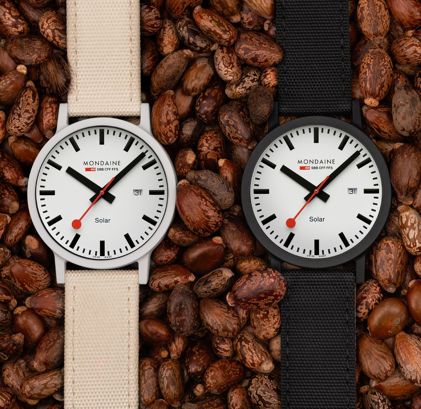Charakteristický design číselníku a precizní rozmístění ručiček zůstávají věrné původní koncepci hodin, které od roku 1944 tikají na přibližně 3000 švýcarských nádražích SBB a na něž má od roku 1986 Mondaine celosvětovou exkluzivní licenci. Kontrastní bílý číselník s černými prvky a výraznou červenou sekundovou ručkou zaručuje nejen výraznou grafickou identitu, ale především výjimečnou čitelnost. Pouzdro i řemínek jsou vyrobené převážně z obnovitelných zdrojů. Modely Mondaine Essence Solar patří mezi nejudržitelnější hodinky současnosti.
