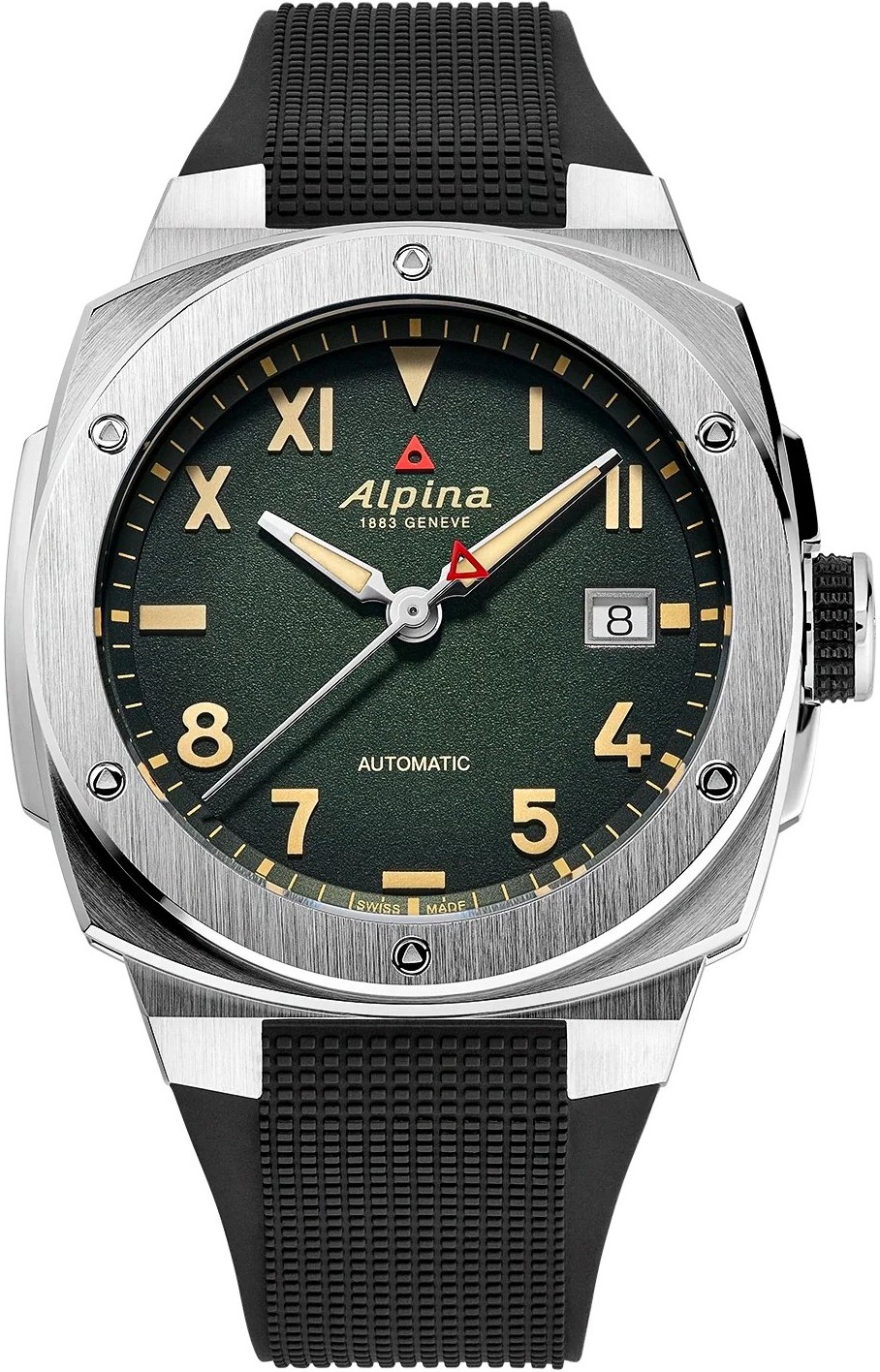 Ocelové pouzdro zůstává věrné povrchové úpravě svých předchůdců: vertikálně kartáčovaná luneta ladně kontrastuje s kruhově saténovaným pouzdrem. Zkosené hrany získaly zrcadlový lesk, který dokonale vyzdvihuje sofistikované linie těchto kultovních hodinek Alpina.